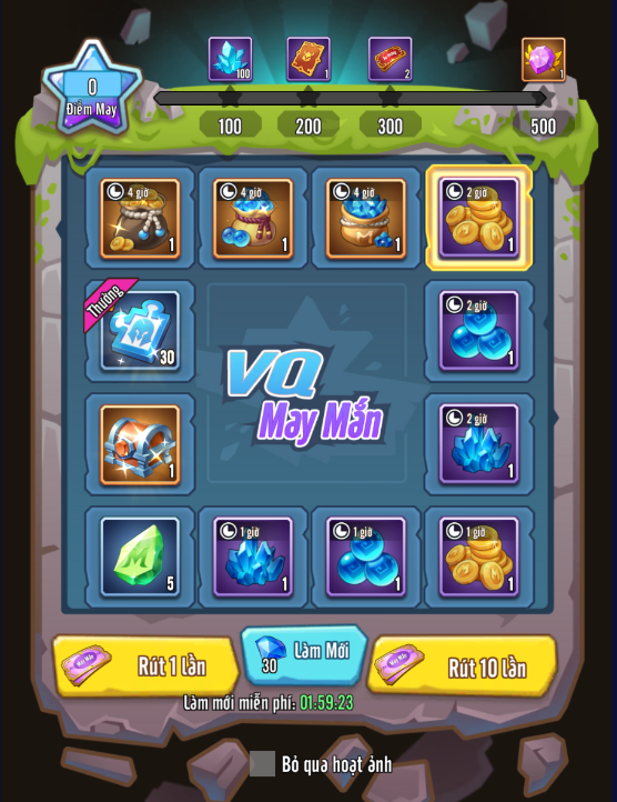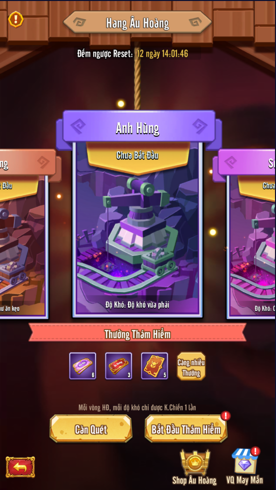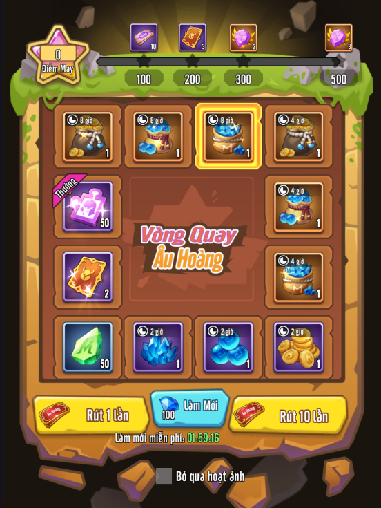 Bạn sẽ nhận được vé rút thưởng sau mỗi tầng và khi hoàn thành thành công cuộc khám phá cuối cùng. Có hai loại vé rút thưởng: Vòng Quay May Mắn và Vòng Quay Âu Hoàng. Giải thưởng lớn trong vòng quay có thể được thay đổi ngẫu nhiên bằng cách làm mới, tùy thuộc vào nhu cầu cá nhân của bạn.