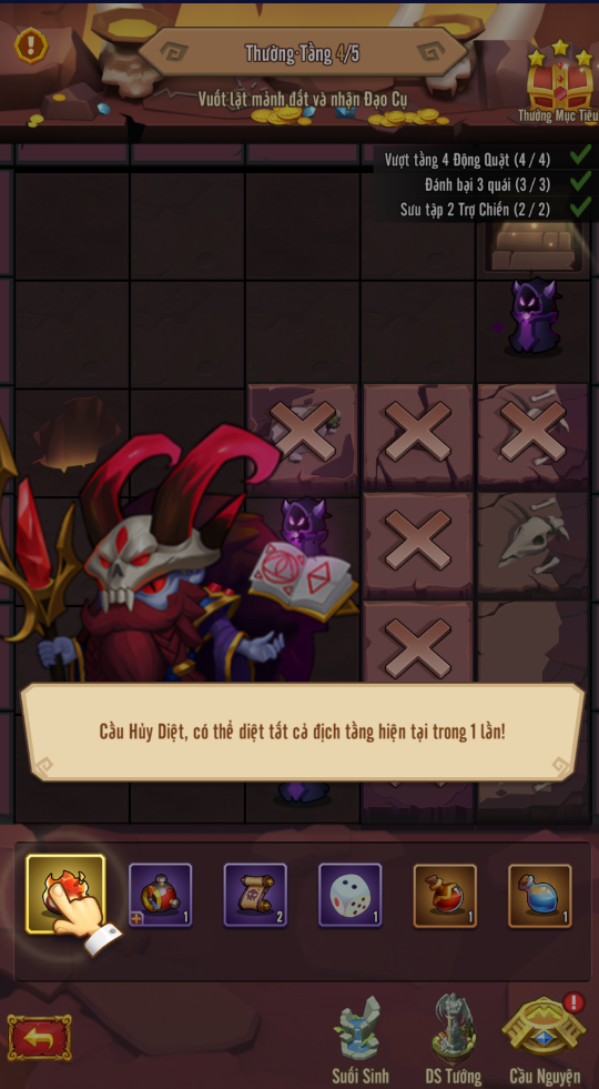 Điều quan trọng cần lưu ý là bạn sẽ gặp kẻ thù trong quá trình khám phá. Kẻ thù sẽ ngăn cản bạn khám phá 8 ô vuông xung quanh chúng. Bạn cần phải đánh bại kẻ thù để mở khóa các ô vuông xung quanh. Cố gắng thu thập càng nhiều vật phẩm càng tốt trong quá trình khám phá, đặc biệt là [Lôi Đình Nhất Chỉ ] và [Cầu Hủy Diệt]. Hãy nhớ giữ chúng cho các cấp độ sau, vì kẻ thù bạn gặp sẽ ngày càng mạnh hơn khi bạn tiến bộ. Sử dụng chúng ở những cấp độ cuối sẽ giảm đáng kể độ khó khi hoàn thành trò chơi. Ngoài ra, hãy nhớ sử dụng tất cả các vật phẩm của bạn trước khi hoàn thành trò chơi, vì chúng sẽ biến mất ngay lập tức sau khi hoàn thành và sẽ không được tích lũy.