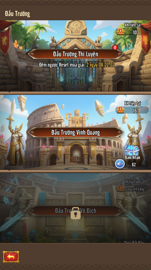 - Người Chơi có thể tốn K.Cương Lượt Mua K.Chiến Đấu Trường Vinh Quang 5. Đấu Trường Vinh Quang tổng kết Danh Vọng thời gian thực, XH càng cao Danh Vọng nhận mỗi giờ càng nhiều
