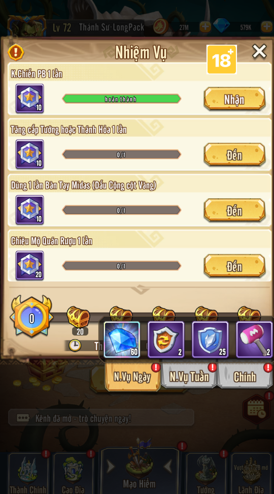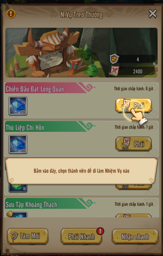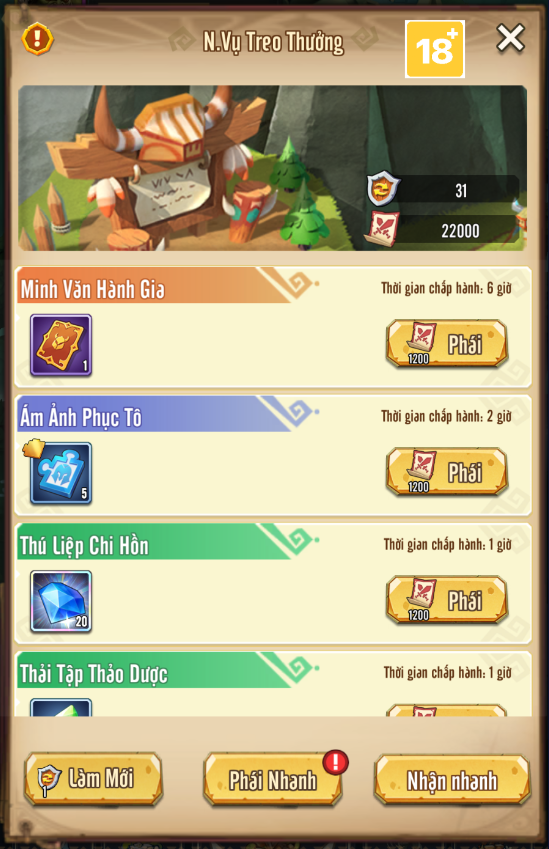 Sau khi người chơi hoàn thành thành công màn 2-16, n.vụ treo thưởng sẽ được mở khóa. Tại đây, lượng tài nguyên miễn phí có sẵn là vô cùng phong phú. Người chơi có thể hoàn thành các nhiệm vụ treo thưởng bằng cách cử các anh hùng đi. Có năm cấp độ nhiệm vụ, từ cao nhất đến thấp nhất: hồng, cam, tím, xanh dương và xanh lá cây. Thời gian hoàn thành và phần thưởng khác nhau tùy thuộc vào màu sắc; nên ưu tiên các nhiệm vụ cấp cao hơn. Ngoài ra, mở khóa thêm bản đồ sẽ mở khóa các trò chơi nhỏ khác nhau, mang lại phần thưởng tài nguyên thậm chí còn nhiều hơn nữa!