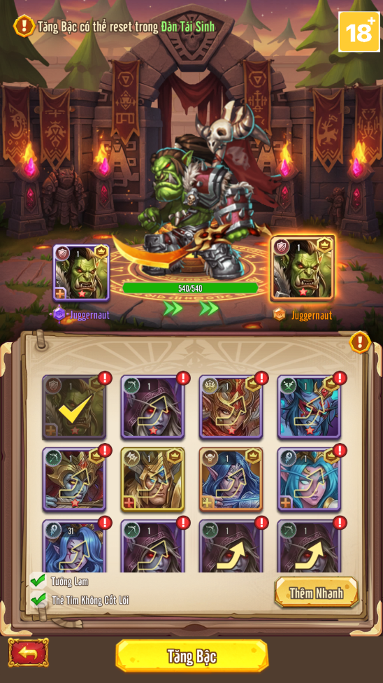 Bạn có thể nâng cấp bất kỳ anh hùng nào cùng cấp độ. Việc hoàn nguyên hoạt động tương tự, tất cả nguyên liệu đã sử dụng cho các lần nâng cấp trước đó đều được hoàn trả – không cần phải trả tiền để thắng hay cày cuốc! Khi phát triển anh hùng ở giai đoạn đầu game, việc ưu tiên các thẻ bài cốt lõi là rất quan trọng! Cấp độ thẻ bài không đủ và đội hình yếu là những lý do chính khiến bạn bị mắc kẹt; việc kết hợp đúng cách các anh hùng cốt lõi sẽ giúp mọi thứ dễ dàng hơn nhiều.